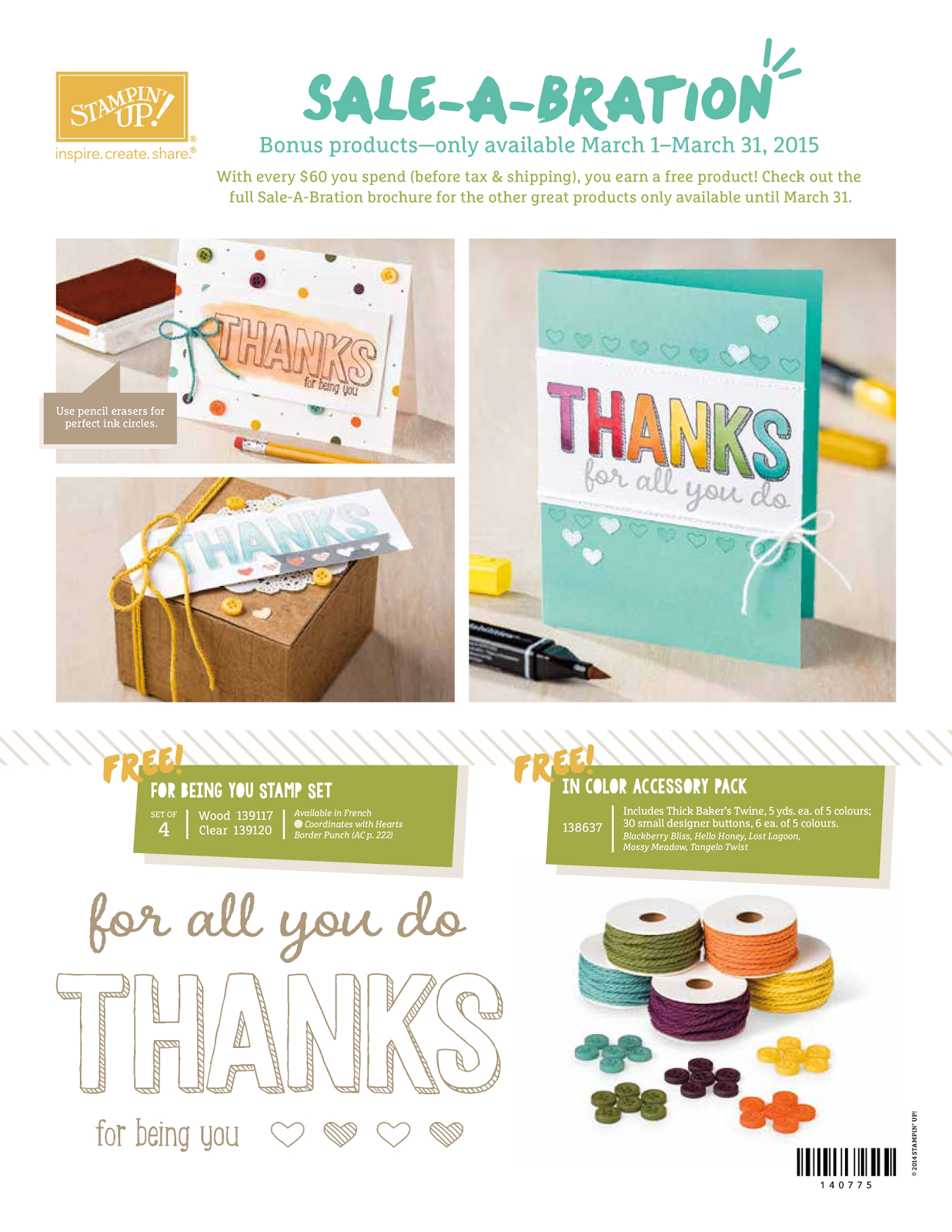 If Sale-a-bration isn't exciting enough, Stampin' Up! is now offering more FREE products! OMGosh! I love them! March 1st can't get here soon enough! I know I will be ordering that In Colour Accessory Pack first off, as I love embellishments! But it is a tough call as I love the stamp sets and the vellum too! Oh me oh my!!