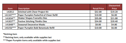 retiring list is out! There are a lot of items on sale, while supplies last - so act quick!